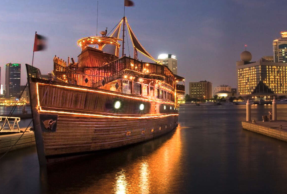 Board the luxurious Dhow Cruise in Dubai Creek to get picturesque views of Dubai Deira Creek from air-conditioned upper and lower decks